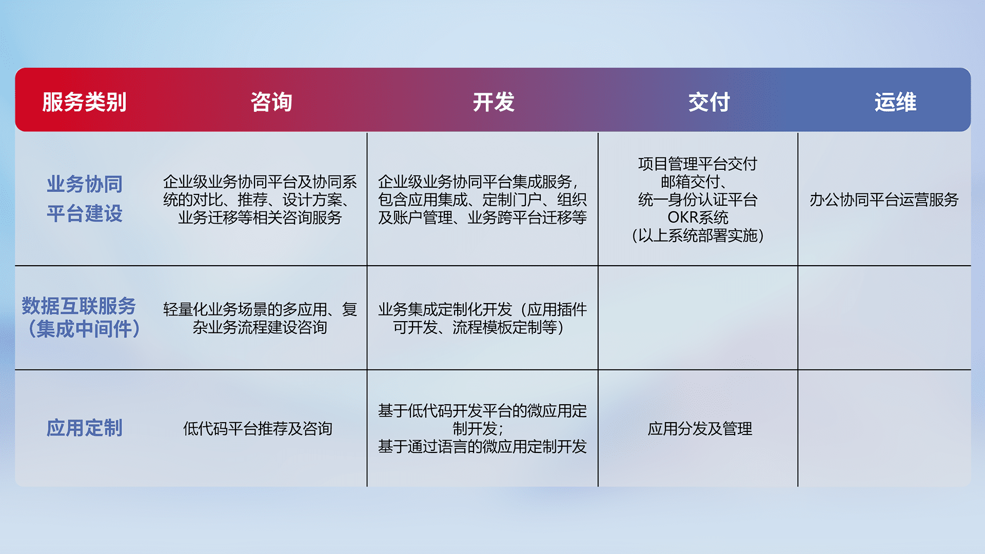 针对钉钉、、、、企微、、、、IDaas等平台级产品提供产品的规划、、方案、、、、交付、、、定制化开发等服务,,实现如统一协同办公、、智能客户服务、、、混合会议管理、、、智能数据查询、、、、等业务场景,,,实现数字化转型。。。。